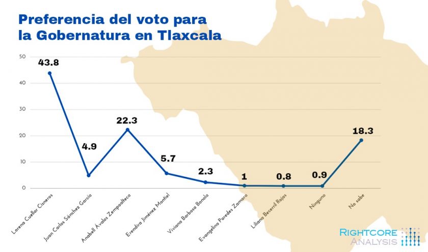 La encuesta Rightcore Analisis, posiciona a la morenista con el 43.8 por ciento y a la priísta con el 22.3 por ciento, mientras que Eréndira Jiménez tiene un 5.7 por ciento y Juan García el 4.9 por ciento.