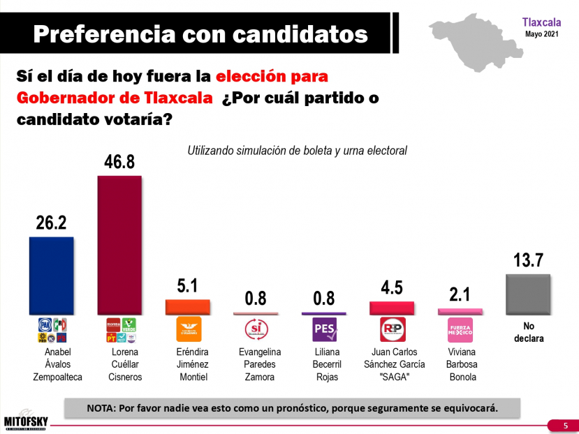 Según la publicación del diario de circulación nacional, la candidata de Morena-PT-PVEM-PES y Nueva Alianza en Tlaxcala, al Gobierno de Tlaxcala lleva la delantera con un 50 por ciento de la intención de voto, mientras que Anabell Ávalos Zempoalteca, de PAN-PRI-PRD-PS-PAC, obtiene el 40 por ciento, y muy por debajo se encuentra Eréndira Jiménez, de Movimiento Ciudadano, con 6 por ciento.