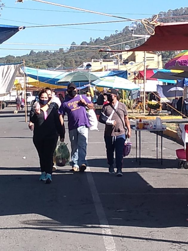 Ante la crisis sanitaria pro Covid -19, los tianguistas se han blindado en términos sanitarios para poder seguir laborando y no verse afectados, para tal efecto acatan las medidas impuestas por las autoridades municipales, como lo es, que cada puesto tenga un metro y medio de distancia el uno del otro, el uso de guantes, cubre bocas y gel antibacterial, todo esto con el objetivo de que la población sienta confianza de salir a sus compras de alimentos y otros enceres del hogar.