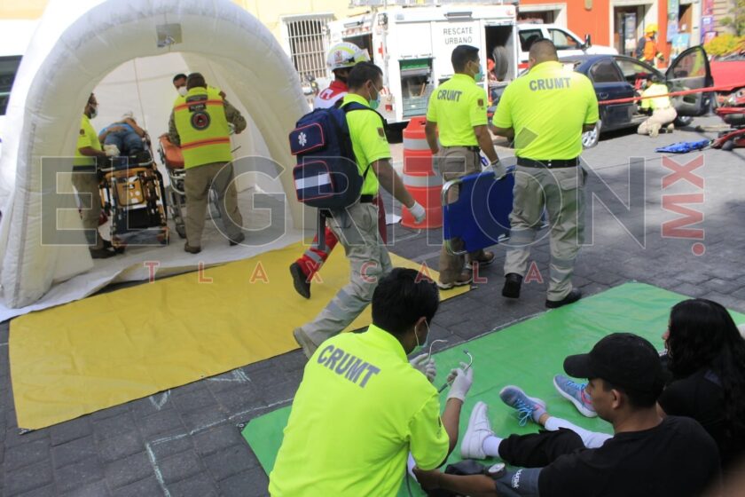 A cargo de Alejandro Garrido, coordinador estatal del Centro Regulador de Urgencias Médicas Tlaxcala (CRUMT), paramédicos de dicha corporación, de protección civil, de la Cruz Roja Mexicana y organizaciones civiles, escenificaron su actuar ante un hecho de tránsito con varios lesionados.