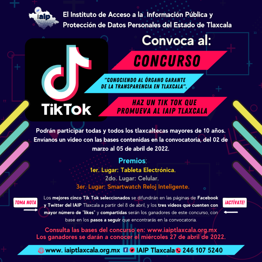 El Instituto de Acceso a la Información Pública y Protección de Datos Personales (IAIP) convocó a la población mayor de 10 años en el estado de Tlaxcala a participar en la convocatoria de concurso de Tik Tok, cuyo objeto es la recepción de trabajos que promuevan al órgano garante y los derechos que tutela.