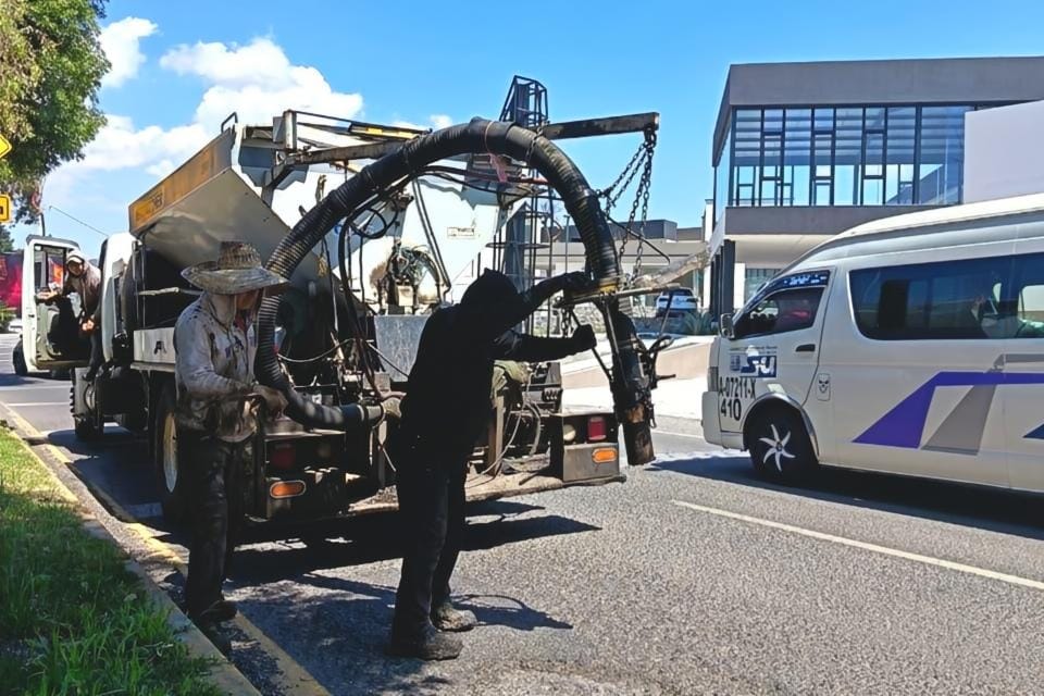 Estas acciones se complementan con tareas de balizado en calles como Del Vecino y Ruiz Cortines, así como bacheo en la calle Diego Muñoz Camargo.