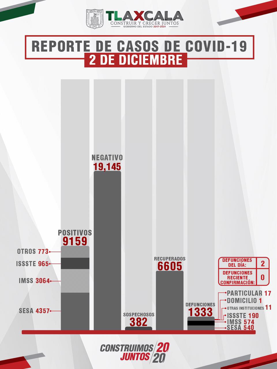 De acuerdo con el reporte del 02 de diciembre, la Secretaría de Salud del Estado (SESA) confirmó 18 personas recuperadas, 2 fallecimientos y 41 casos positivos de Covid-19 de tlaxcaltecas identificados en el estado.