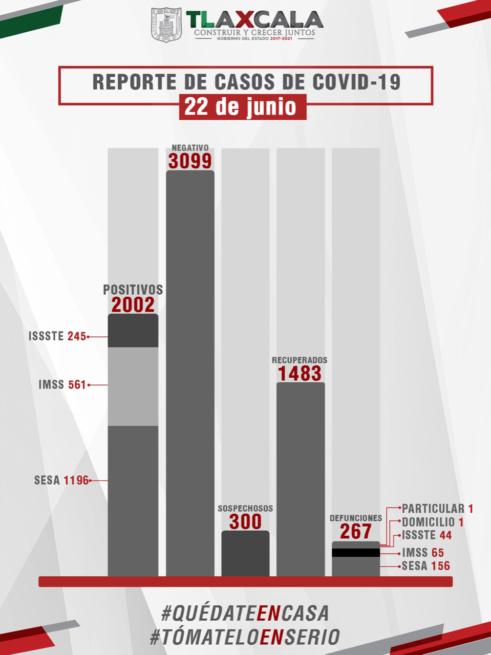 Hasta este momento, Tlaxcala registra 287 casos, Apizaco y Chiautempan 181, Huamantla 118, Zacatelco 99, Yauhquemehcan 70, Contla 68, San Pablo del Monte 53, Totolac 47, Calpulalpan 45, Papalotla 42, Panotla 34, Hueyotlipan y Apetatitlán 33, Tetla 32, Tlaxco, y Santa Cruz Tlaxcala 31, Ixtacuixtla 30; Teolocholco 28, Tepetitla de Lardizabal 27; Nativitas 25; Tepeyanco 24, Santa Ana Nopalucan, Cuapiaxtla y Xicohtzinco 22.