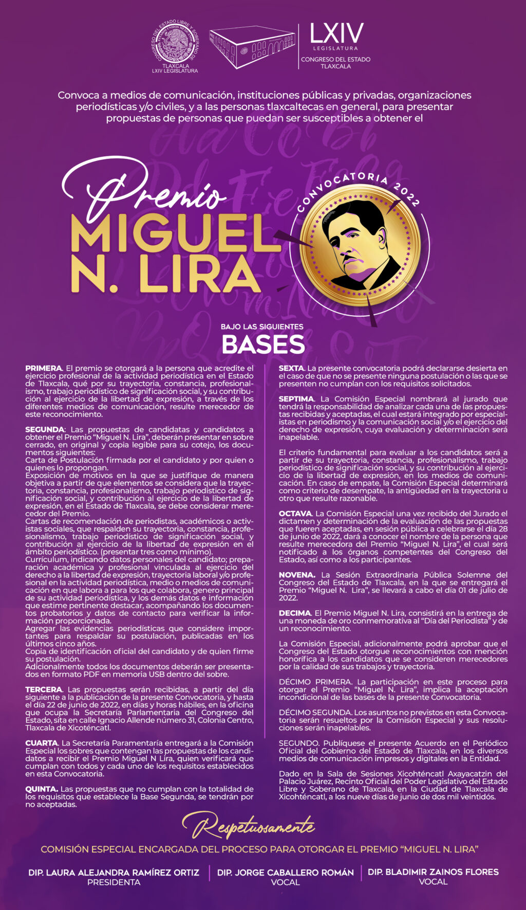 La LXIV Legislatura del Congreso del Estado, a través de la Comisión Especial encargada del proceso para otorgar el premio “Miguel N. Lira 2022”, convoca a medios de comunicación, instituciones públicas y privadas, organizaciones periodísticas o civiles, así como a las personas tlaxcaltecas en general, para presentar propuestas de personas que puedan ser susceptibles a obtener el premio.