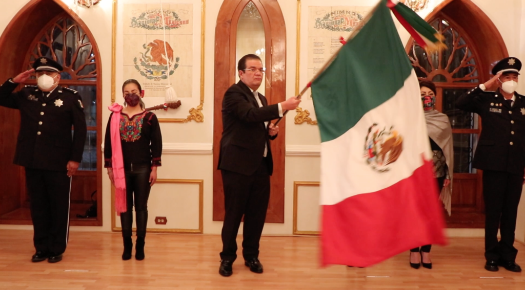 Este 15 de septiembre la Secretaria del Ayuntamiento, María Tita Matilde Mendoza Mucha, dio lectura al acta de Independencia; al término, la Síndico Daniela Fuentes Victoria, entregó la Bandera Nacional a la escolta de la Dirección de Seguridad Pública, Tránsito y Protección Civil Municipal, quienes minutos después hicieron lo propio al munícipe, quien vitoreó los nombres de los insurgentes que dieron patria y libertad a nuestro país.