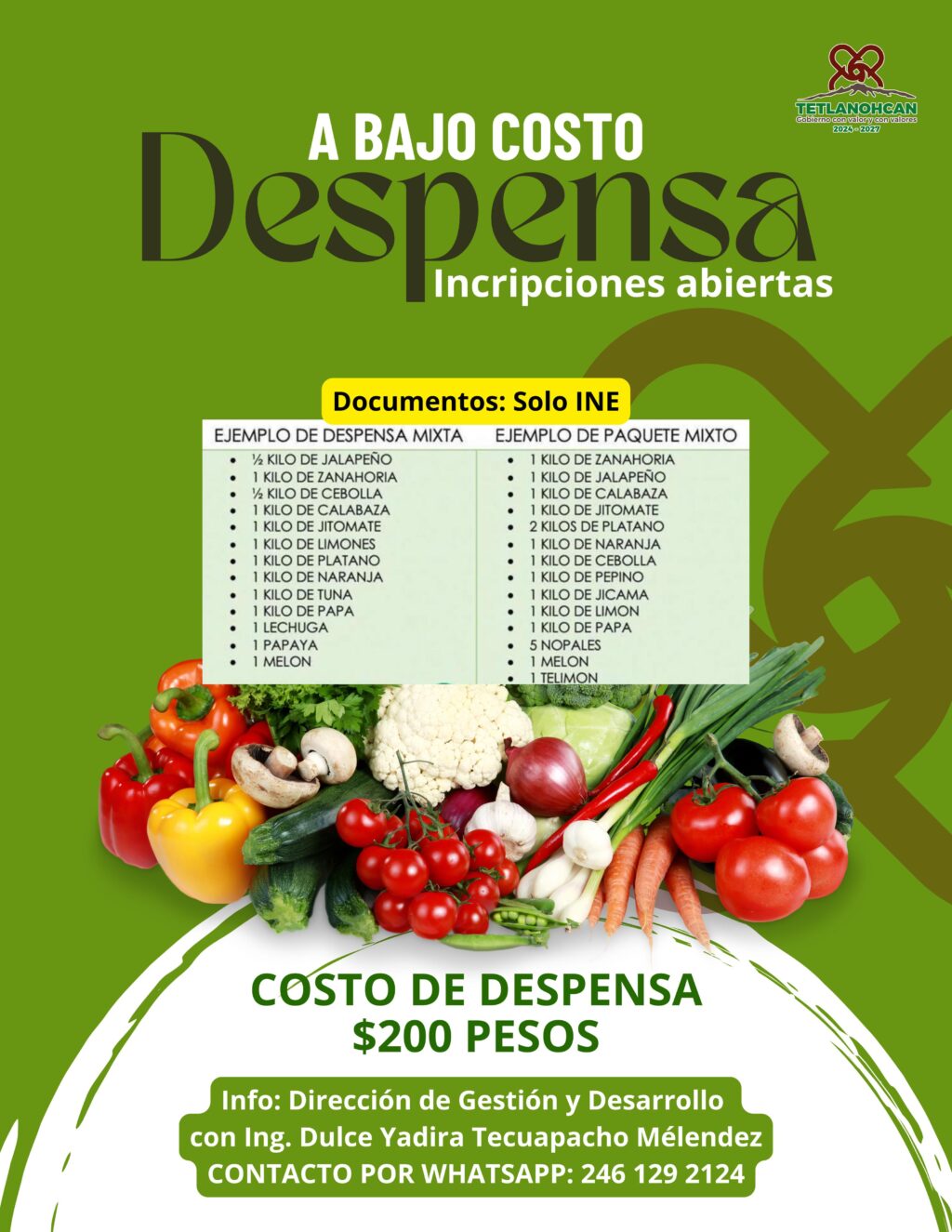 El Gobierno Municipal de Tetlanohcan, encabezado por la presidenta Kritsbey Pérez Flores, informa a la ciudadanía que siguen abiertas las inscripciones para el programa de Despensa a Bajo Costo, que ofrece productos frescos y de calidad por solo $200 pesos.