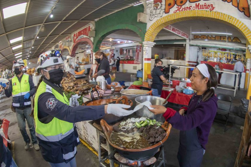 El Gobierno del Estado mantiene la instalación de filtros sanitarios en tianguis dominicales de la entidad, a través de las brigadas de la Coordinación Estatal de Protección Civil (CEPC) y de la Secretaría de Salud (SESA), quienes distribuyen gel antibacterial y cubrebocas, con el objetivo de prevenir contagios de Covid-19.