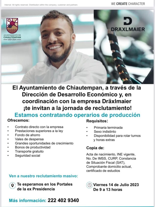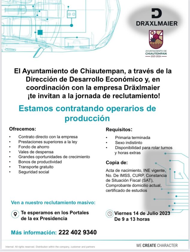 El Ayuntamiento de Chiautempan a través de la Dirección de Desarrollo Económico y en coordinación con la empresa Dräxlmaier, convoca a la población en general, a la jornada de reclutamiento de operarios de producción el próximo viernes 14 de julio.