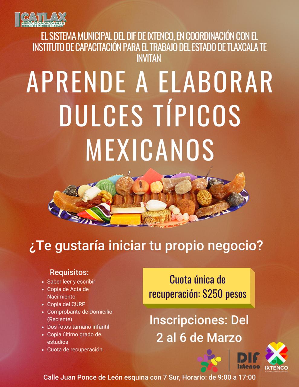 El Sistema Municipal del DIF de Ixtenco, en coordinación con el Instituto de Capacitación para el Trabajo del Estado de Tlaxcala (ICATLAX), convocan a los interesados en iniciar un negocio propio, a integrarse a los cursos de elaboración de dulces típicos mexicanos.