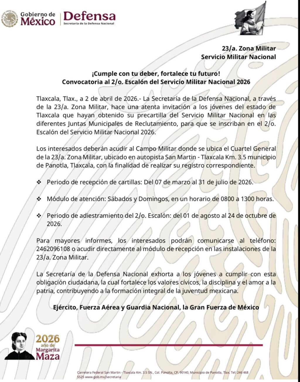 La Secretaría de la Defensa Nacional (Sedena), a través de la 23/a. Zona Militar, emitió la convocatoria dirigida a jóvenes del estado, incluyendo Tetlanohcan, que ya cuentan con su precartilla del Servicio Militar Nacional, para integrarse al 2/o. Escalón 2026.