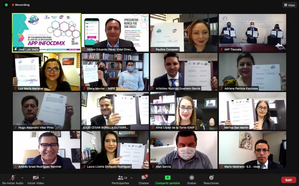 Lo anterior, durante la Firma de Convenio de Colaboración para el Uso de la Aplicación APPINFOCDMX entre el Instituto garante en la Ciudad de México y los de Tlaxcala, Morelos, Durango, y Chiapas, celebrada este jueves a través de la plataforma Zoom.