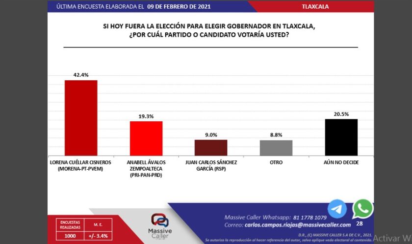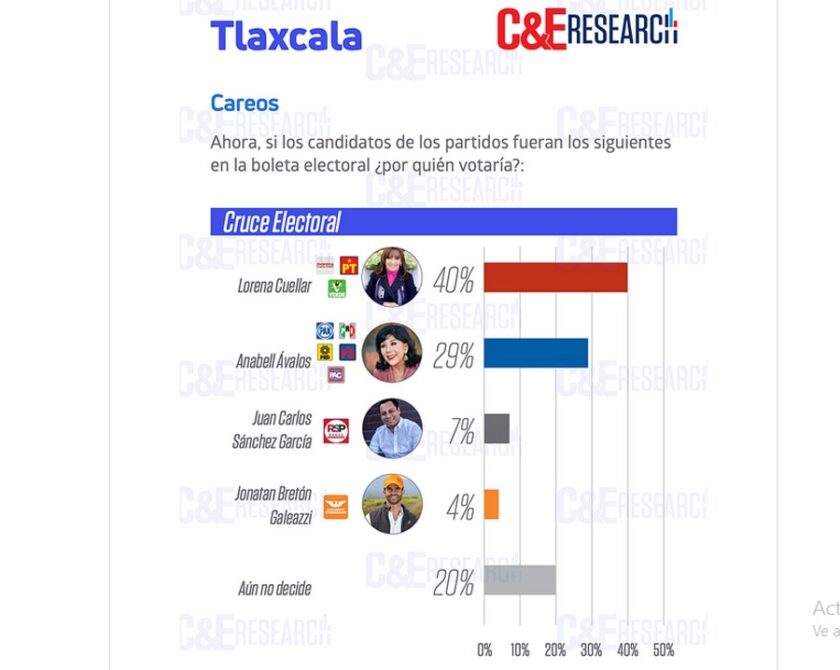 La segunda es de C&E donde la candidata de la coalición “Juntos Haremos Historia en Tlaxcala”, Lorena Cuellar, tiene una ventaja del 40% sobre Anabell Ávalos con 29%