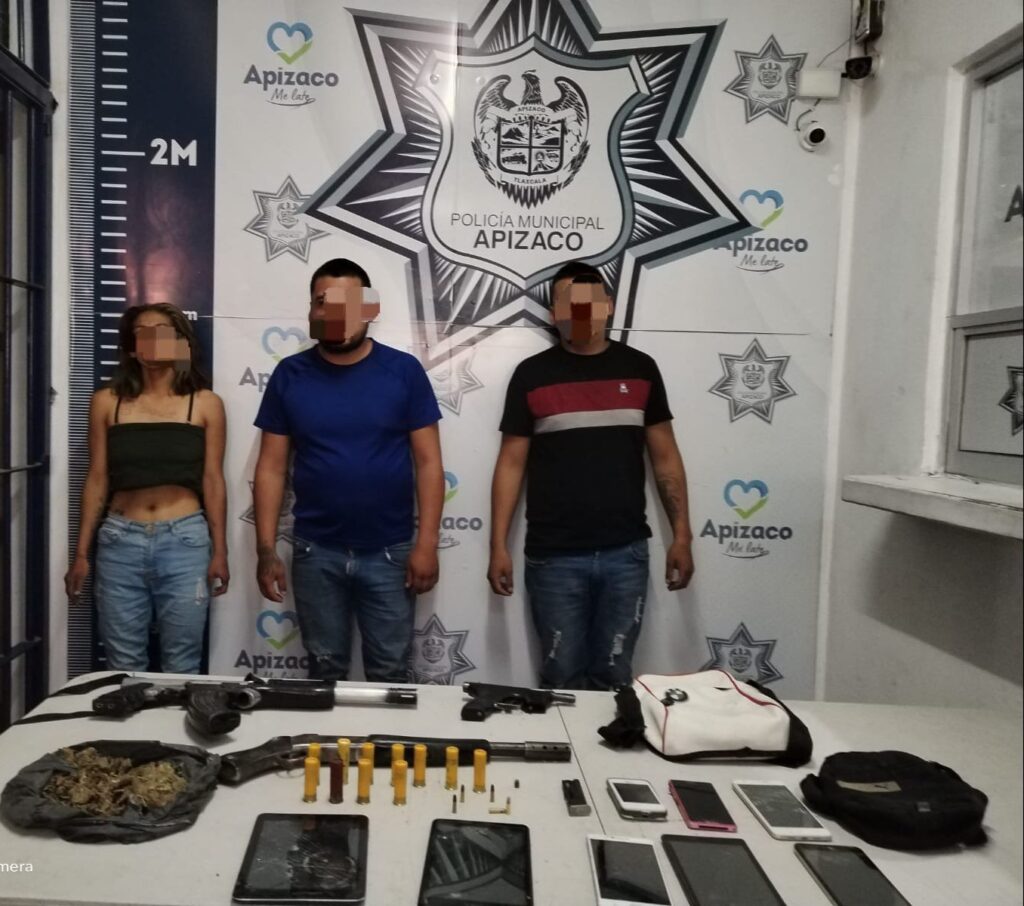 Los detenidos se identificaron como Olga Lidia N., de 24 años de edad, originaria de Poza Rica, Veracruz, Pedro Giovanni N., de 19, y Mario N., de 26, ambos originarios de Apizaco, y se les aseguró una arma de fuego tipo pistola, abastecida con seis cartuchos útiles calibre .22, una escopeta con la leyenda “Stevens Savage Armas Company Mass USA”, abastecida con un cartucho calibre .20, un subfusil color negro, con la leyenda “Warning”, cuatro cartuchos útiles calibre .20, un cartucho útil calibre .16, un envoltorio de plástico el cual en su interior llevaba hierba seca, color verde, con características propias de la marihuana, y una motocicleta marca Kawasaki, tipo Z750, modelo 2003, color azul metálico, con rines color amarillo y sin placas de circulación.