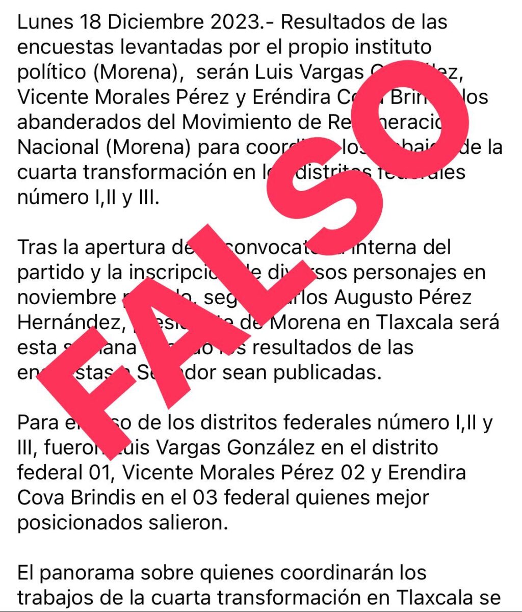 Y es que de manera repentina y en afán de confundir a simpatizantes y militantes de morena se han revelado datos sin sustento y sin ser comunicados oficiales, por lo que se recomienda no caer en especulaciones y esperar los resultados por los canales de comunicación que maneja movimiento de regeneración nacional en Tlaxcala.