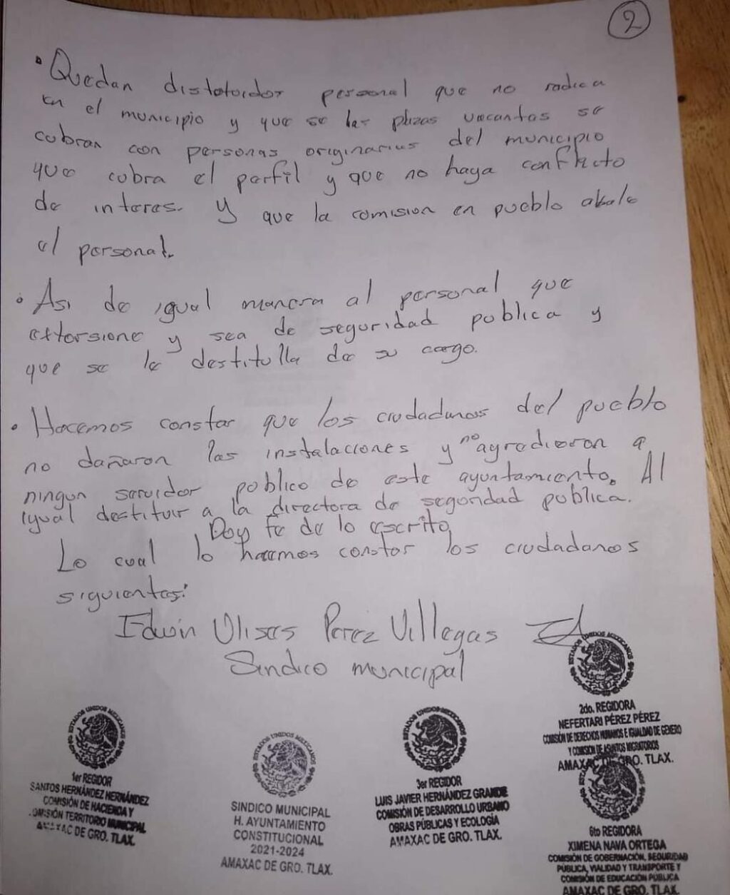 El pliego petitorio, fue firmado y sellado por parte de el síndico y cinco regidores.