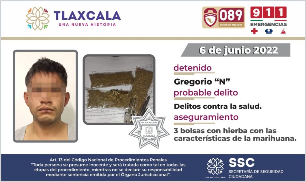 La Secretaría de Seguridad Ciudadana (SSC), a través de la Dirección de Seguridad Delegación Zacatelco, aseguró a una persona presuntamente responsable de cometer delitos contra la salud en su modalidad de narcomenudeo en el municipio de Santa Isabel Xiloxoxtla.