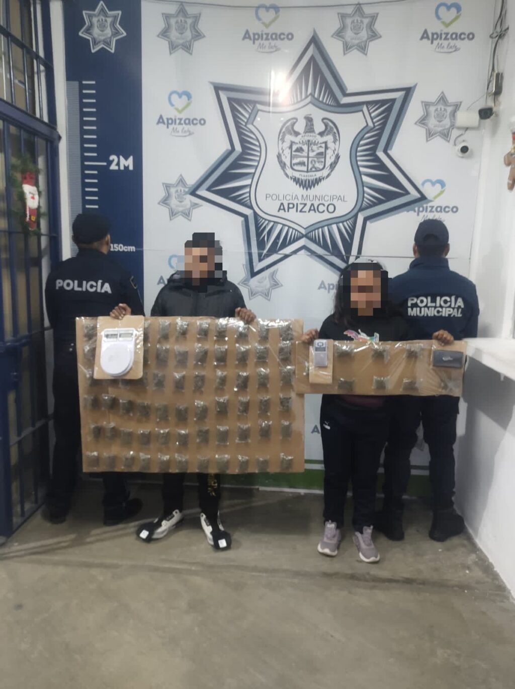 Al hacer una inspección a ambas personas, fueron localizadas múltiples bolsas plásticas que en su interior tenían una sustancia con características propias de marihuana, al igual que unas básculas.