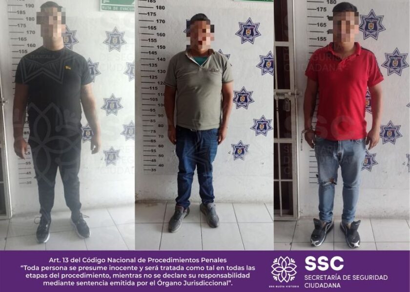 Otras tres personas del sexo masculino fueron señaladas como probables responsables de robo con violencia, en un domicilio particular ubicado en la Colonia Jardines de San Benito Xaltocan, municipio de Yauhquemehcan, además de intentar huir en un vehículo Volkswagen, tipo GLI Jetta, color azul. Se trata de Emilio N., de 26 años, José Jesús N., de 18 años y José Sebastián N., de 22 años.