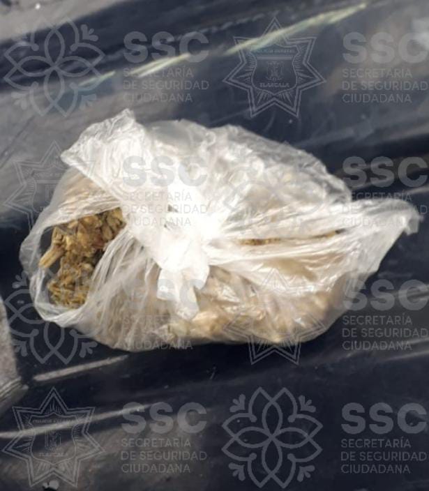Se procedió a inquirir al sujeto y al realizarle una inspección preventiva se localizó entre sus pertenencias un envoltorio con hierba seca con características similares a la droga conocida como marihuana.