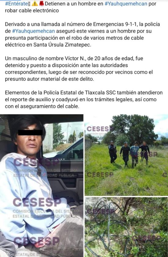Las diferentes estrategias de reacción de la Dirección de Seguridad Pública Municipal de Yauhquemehcan, permitió la detención de un sujeto por robo de cable, durante la mañana del pasado viernes 29 de julio.