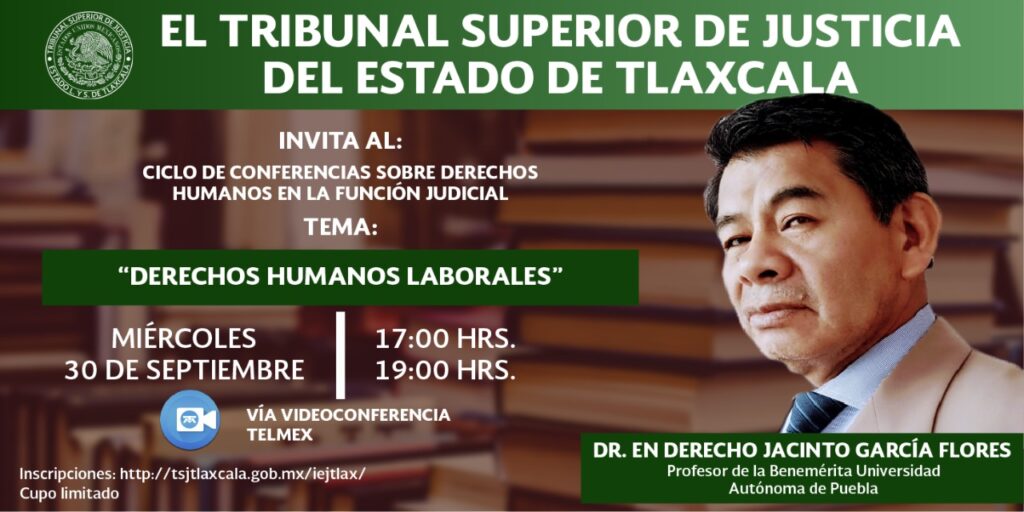 El Tribunal Superior de Justicia en el Estado (TSJE) dará continuación este miércoles con el ciclo de videoconferencias denominado “Derechos Humanos en la Función Judicial”, con la participación del destacado académico y litigante experto en materia de Derecho del Trabajo y Derecho de la Seguridad Social, Jacinto García Flores, quien disertará la conferencia “Derechos Humanos Laborales”.