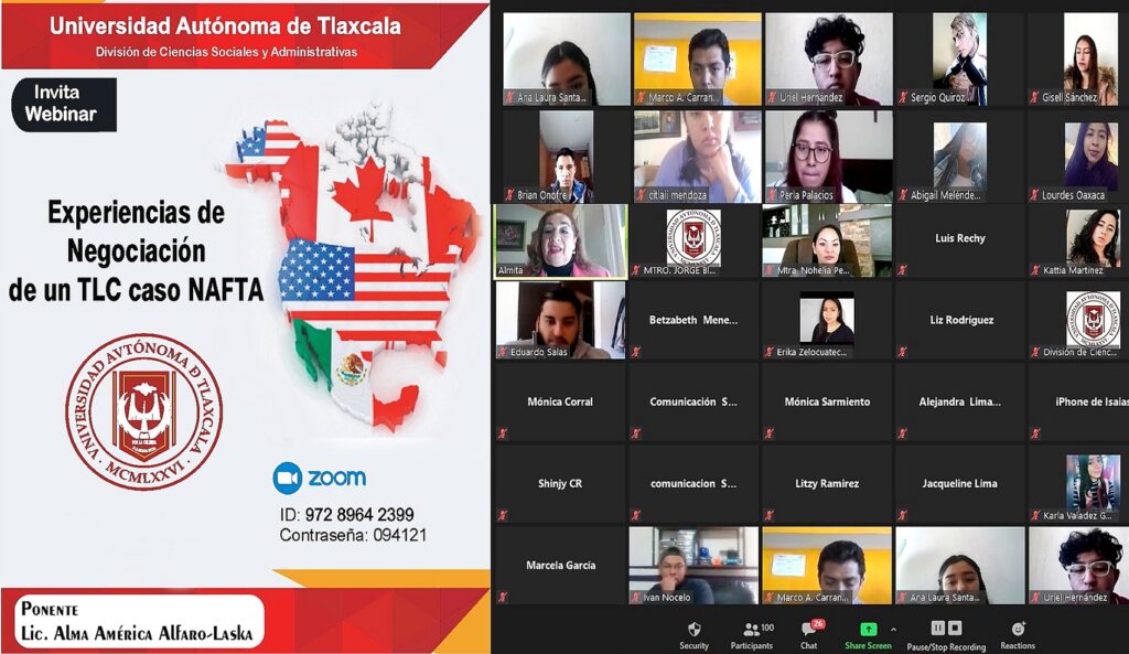Con el objetivo de conjuntar los conocimientos adquiridos y la experticia que vierten las voces que marcan la construcción de nuevos aprendizajes, la División de Ciencias Sociales y Administrativas de la Universidad Autónoma de Tlaxcala (UATx), llevó a cabo los webinars “Cultura de los negocios en Estados Unidos” y “Experiencias de negociación de un TLC, caso NAFTA”, impartidos por la Lic. Alma América Alfaro-Laska, dirigidos a los estudiantes de la Licenciatura en Negocios Internacionales de la Facultad de Ciencias Económico Administrativas.