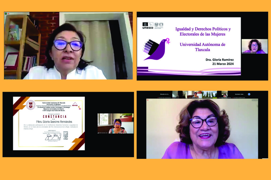 Para finalizar las actividades conmemorativas al Día Internacional de la Mujer, la Universidad Autónoma de Tlaxcala (UATx), la Secretaría Académica, el Programa Universitario para la Autorrealización y la Igualdad de Género (PUAIG), la Facultad de Trabajo Social, Sociología y Psicología, la Maestría en Estudios de Género y la Unidad Académica Multidisciplinaria Campus San Pablo del Monte, realizaron la conferencia virtual intitulada “Derechos Humanos e Igualdad de Género”, a cargo de la Doctora Gloria Ramírez Hernández.