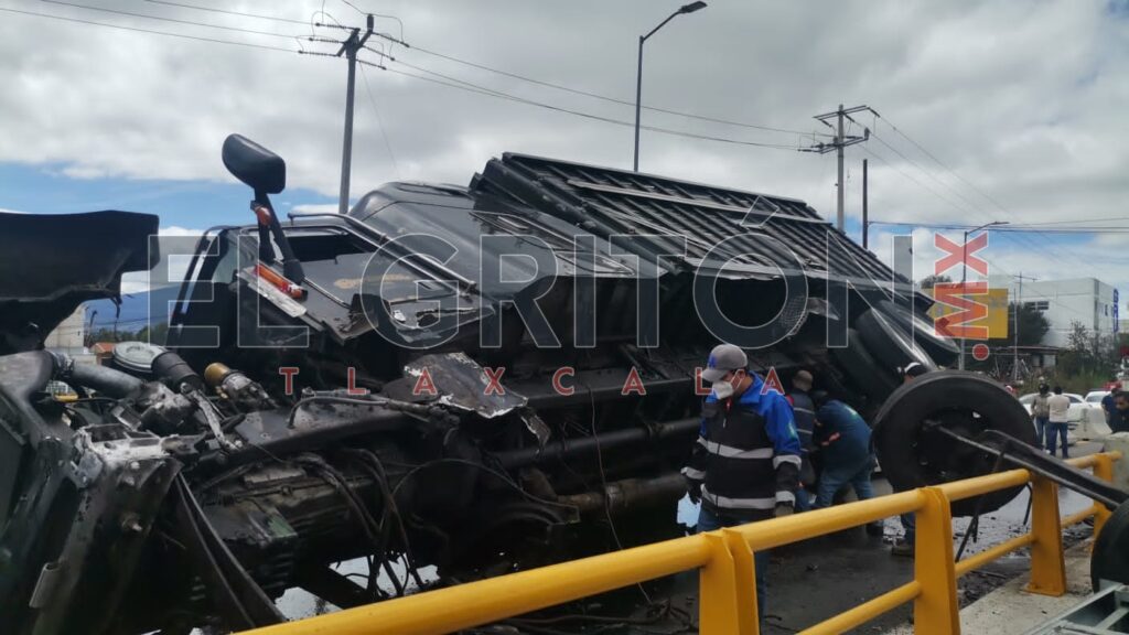 Aparatoso accidente de un tractocamión registrado la mañana de este domingo, dejó como saldo dos personas lesionadas y cuantiosos daños materiales en el distribuidor vial “Xicohténcatl”, a la altura del municipio de Yauhquemehcan.