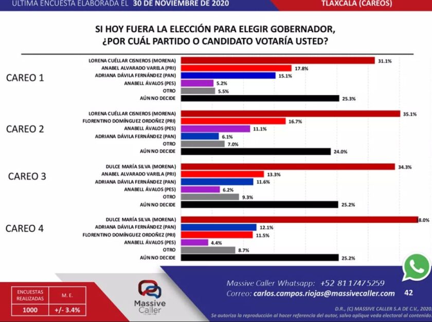 Tercer careo, Dulce Silva Hernández: 34.3 por ciento. Cuarto careo, Dulce Silva 38.0 por ciento.