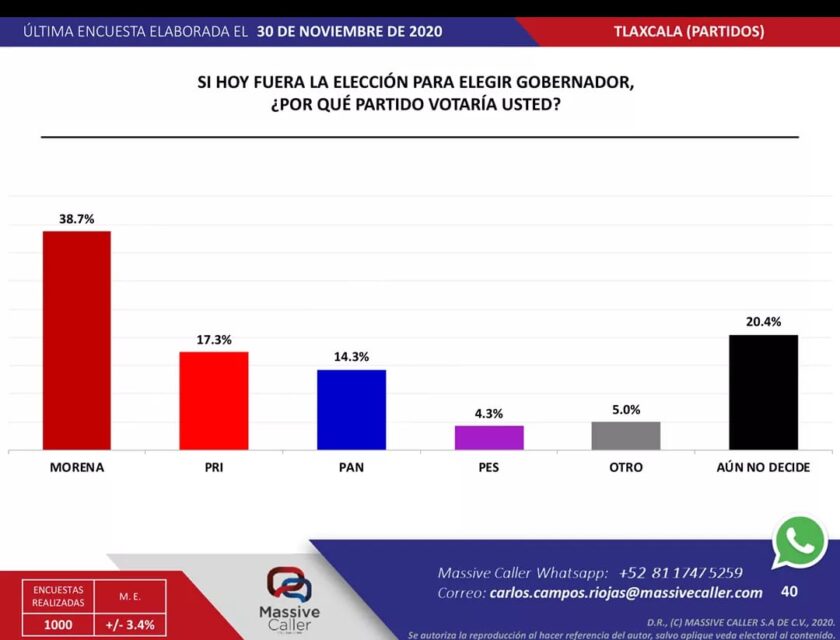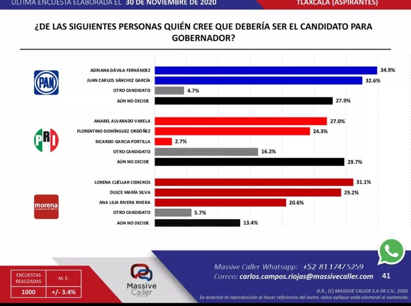 En empate técnico resultó la pregunta: ¿Quién cree que deba ser candidato a gobernador/a de Tlaxcala?. La diputada federal del PES y la empresaria morenista tienen estas cifras: Cuéllar 31.1, Silva 29.2, rezagada Ana Lilia Rivera con 20.6 por ciento.