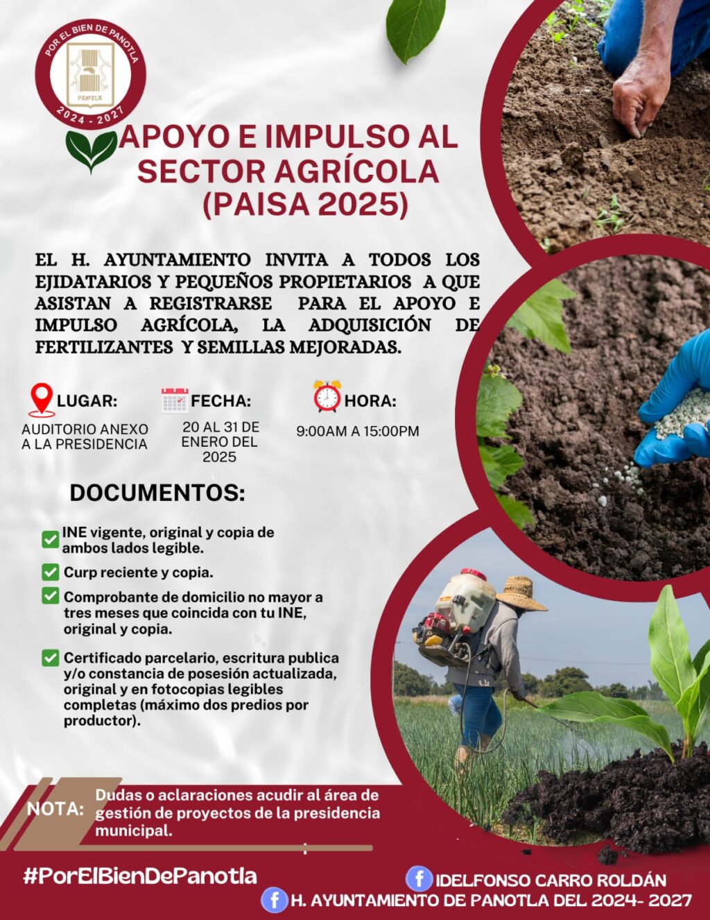 El Ayuntamiento de Panotla el cual encabeza el Presidente Municipal Idelfonso Carro Roldán, a través de la Dirección de Gestión de Proyectos, invita a los productores del municipio a participar en el registro para los programas de apoyo e impulso al sector agrícola (PAISA 2025), sobre los subsidios para la adquisición de insumos agrícolas como fertilizantes y semillas mejoradas.