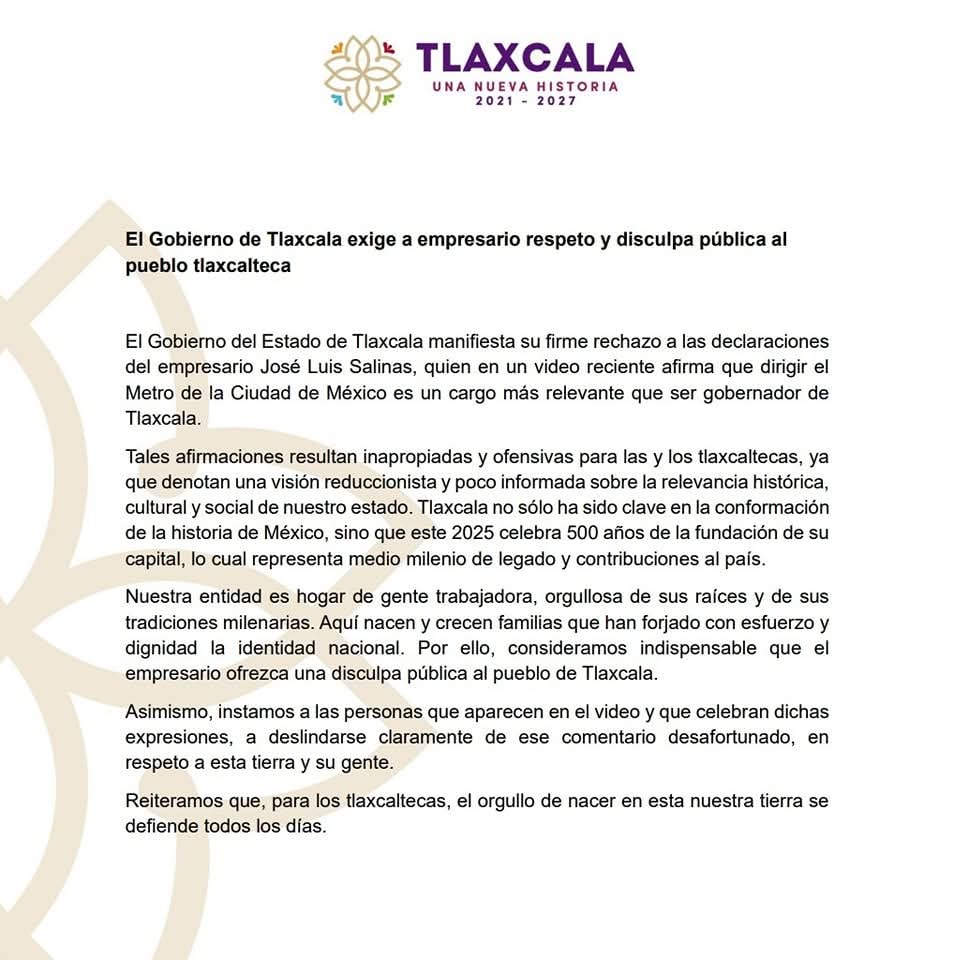 El Gobierno del Estado de Tlaxcala manifiesta su firme rechazo a las declaraciones del empresario José Luis Salinas, quien en un video reciente afirma que dirigir el Metro de la Ciudad de México es un cargo más relevante que ser gobernador de Tlaxcala.