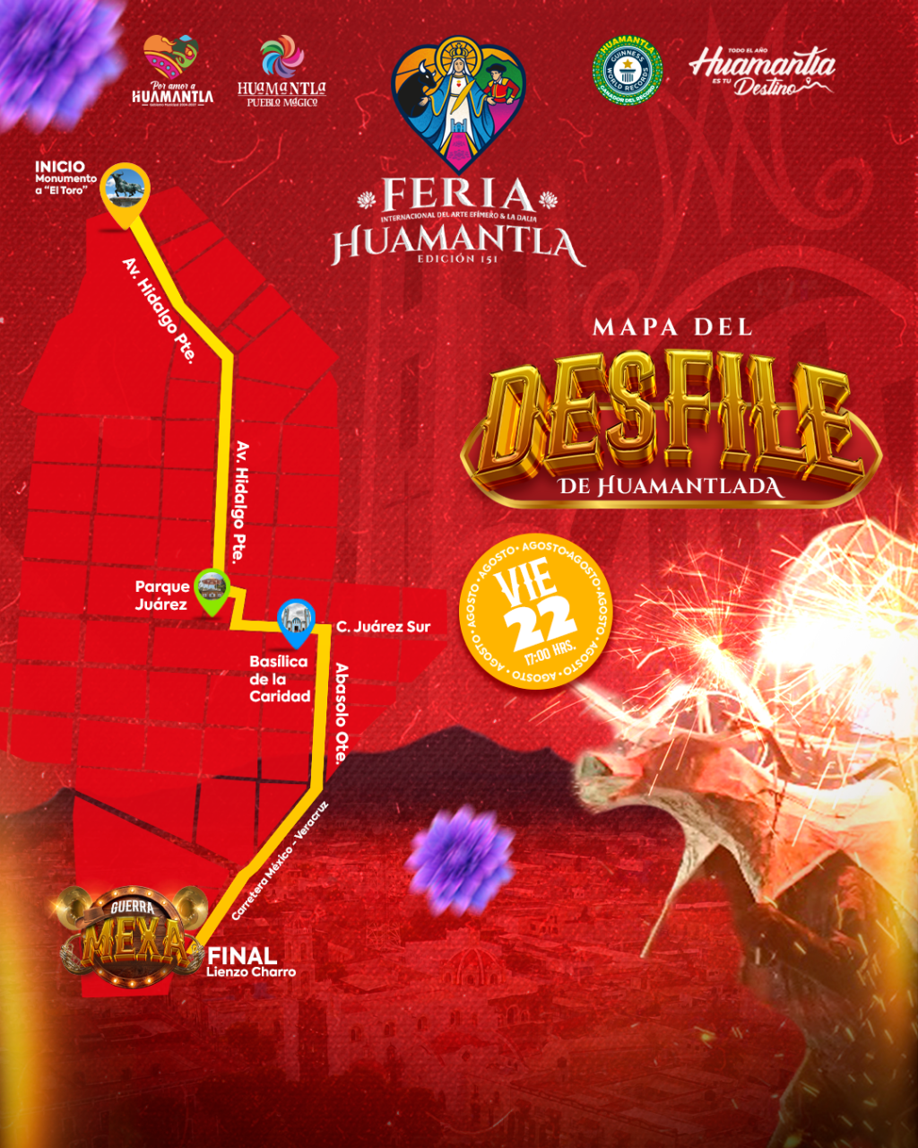 En el marco de la Feria Internacional del Arte Efímero y la Dalia 2025, el Gobierno Municipal de Huamantla informa que el tradicional Desfile Taurino de la Huamantlada cambiará de recorrido y, por primera vez, no pasará por el circuito de burladeros. Esta decisión se basa en tres ejes: el bienestar del toro, la seguridad de las y los asistentes, y el sentir de la ciudadanía.