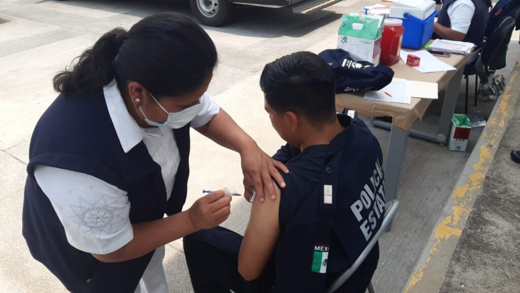De esta manera, los encargados del orden público contribuyen en materia de salud y el área médica informa que el 100 por ciento de los elementos cuenta con las dosis y refuerzos correspondientes.
