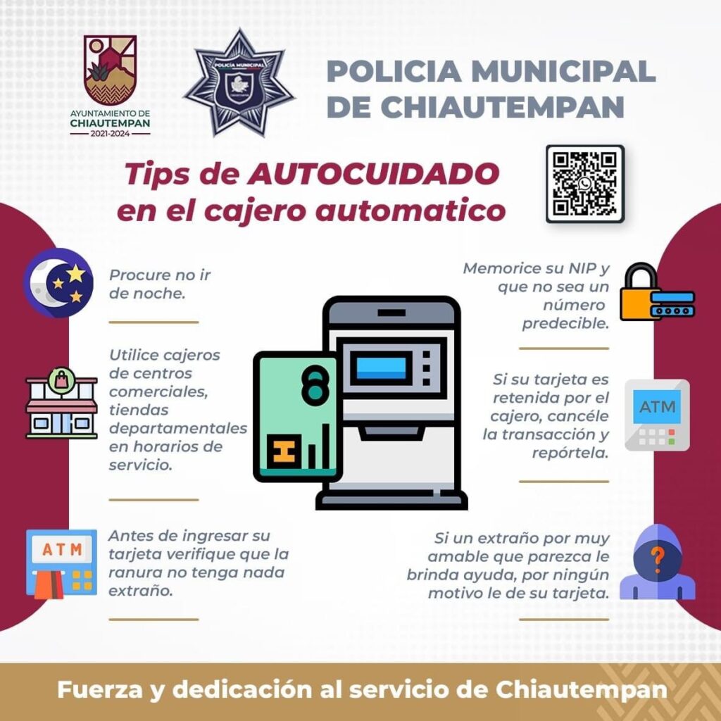 Con el objetivo de mantener saldo blanco durante esta temporada decembrina, el Ayuntamiento de Chiautempan a través de la Dirección de Seguridad Pública Municipal emite las siguientes recomendaciones de autocuidado a los chiautempenses que usan cajeros automáticos del municipio.