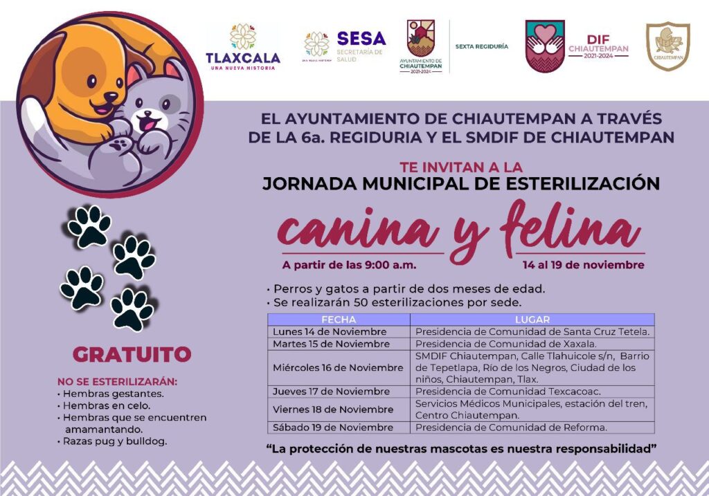 Para contribuir con el bienestar animal y cuidar la integridad y vida de los animales de compañía, el Ayuntamiento de Chiautempan a través de la Sexta Regiduría y en coordinación con el Sistema Municipal para el Desarrollo Integral de la Familia (SMDIF) y la Secretaría de Salud del Estado (SESA), realizarán una campaña gratuita de esterilización canina y felina.