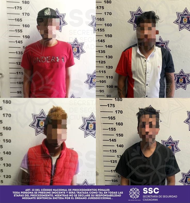 Al respecto, policías estatales detuvieron en flagrancia por el delito de robo a Daniel N., de 23 años, Abraham N. de 20 años, José Erick N., de 21 y José Alfredo N. de 27 años originarios de Ciudad de México, Huejotzingo, Puebla y Tlaxcala; quienes fueron señalados directamente de despojar a un conductor de su unidad Volkswagen, tipo Vento, color blanco, modelo 2019 que presta servicio público local de la ruta de Apizaco.