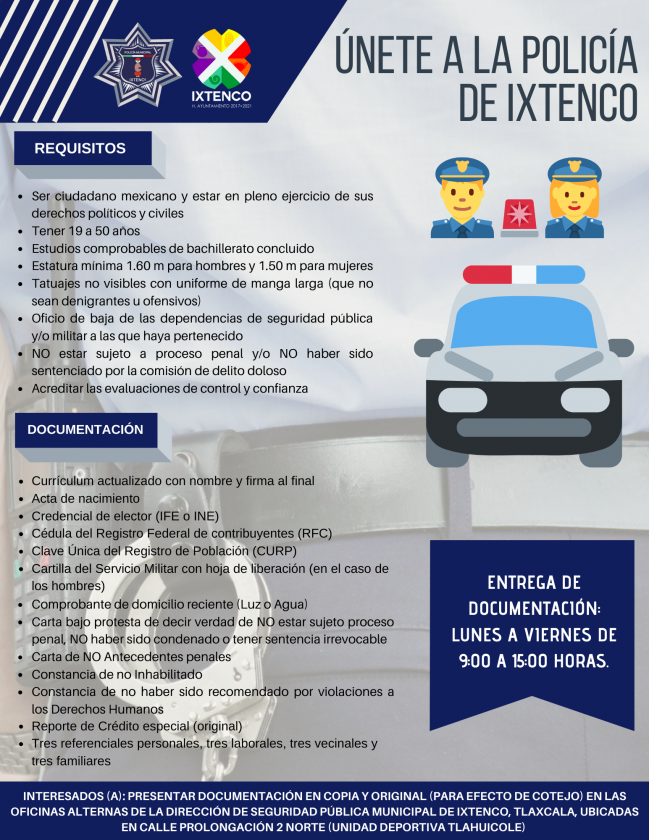 Los interesados (a) deberán presentar documentación en copia y original (para efecto de cotejo) en las oficinas alternas de la Dirección de Seguridad Pública Municipal de Ixtenco, ubicadas en calle Prolongación 2 Norte (unidad deportiva Tlahuicole), con horarios de 9:00 a 15:00 hrs.