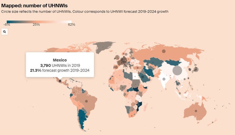 A pesar de que 2019 fue un año “tumultuoso”, el número de Individuos con Patrimonio Neto Ultra Elevado (UHNWI, por sus siglas en inglés) –es decir, personas con más de 30 millones de dólares– creció 6.4% a nivel global y alcanzó una población de 513 mil 244 personas, equivalente a la que vive en la alcaldía Cuauhtémoc de la Ciudad de México.