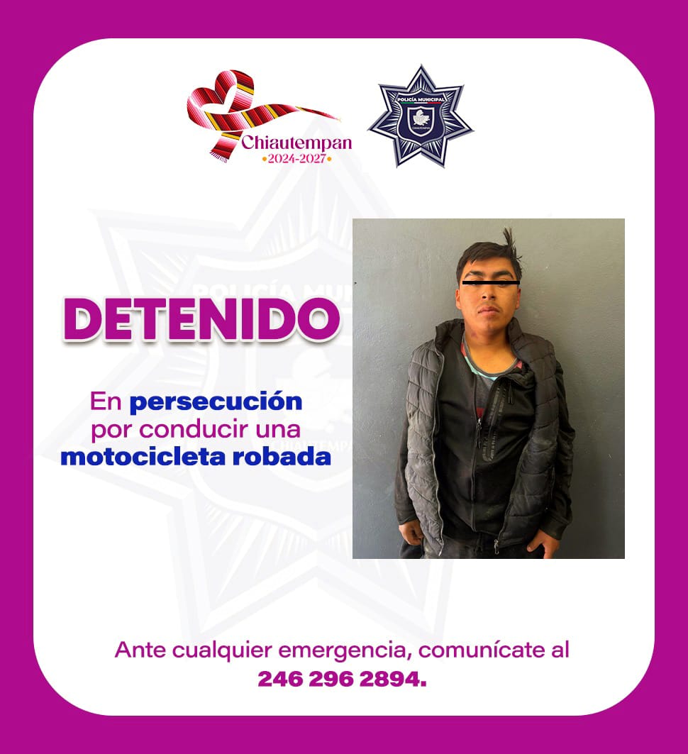 Elementos de la Dirección de Seguridad Pública del municipio de Chiautempan lograron la detención de un hombre en la comunidad de Tlalcuapan, luego de una persecución que inició tras detectar una motocicleta con reporte de robo proveniente del municipio de Apizaco.