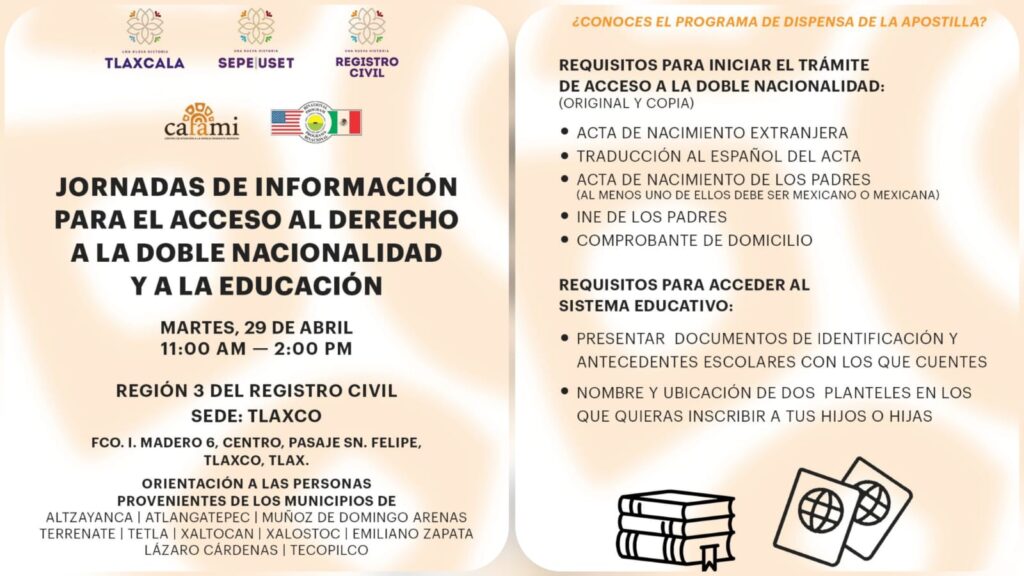 Ante el inminente regreso de connacionales que radican en el extranjero y regresarán a su natal Tlaxco, el Gobierno municipal en coordinación con el Gobierno del Estado llevarán a cabo una campaña de información del programa de “Dispensa de la apostilla” para el acceso al derecho a la doble nacionalidad y a la educación que tendrá verificativo el martes próximo.