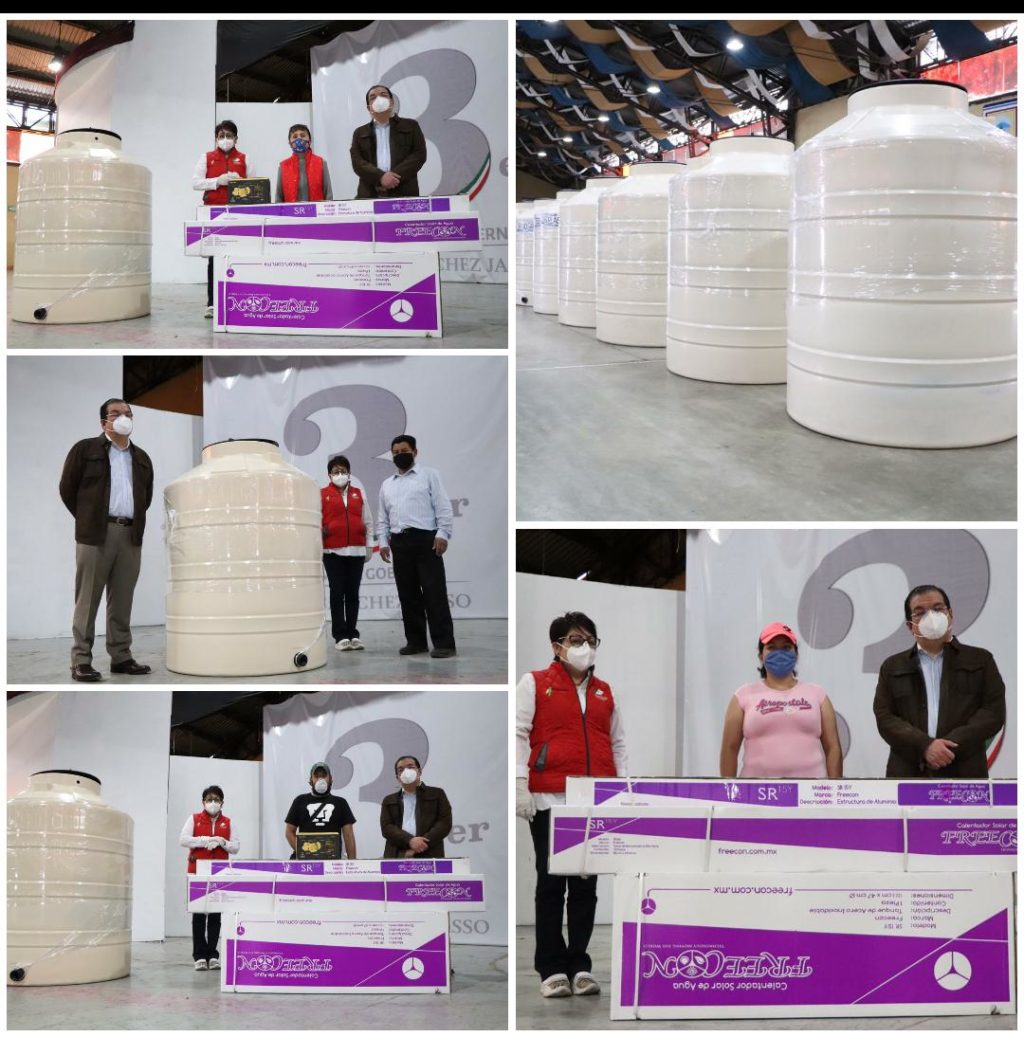 Aplicando las medidas sanitarias implementadas por los tres niveles de gobierno el alcalde y su esposa entregaron 24 calentadores solares de 12 y 15 tubos respectivamente; 5 de 18 tubos; 4 de 20 y 24 tubos respectivamente, así como 20 bombas para agua y 22 tinacos tipo rotoplas.
