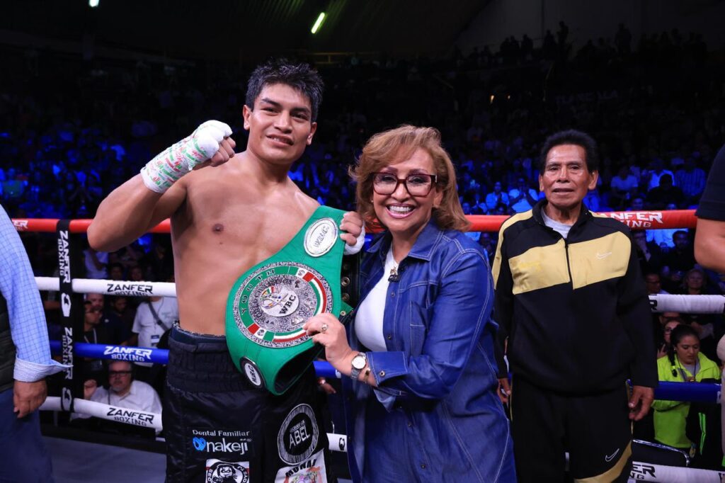 Cuéllar Cisneros acompañada del referente del boxeo en México y excampeón mundial con 107 triunfos, Julio César Chávez, así como del director del Instituto del Deporte de Tlaxcala (IDET), Daniel Moncayo Cervantes, subió al ring para entregar a Berchelt el cinturón de oro de la FecarBox, que lo acredita como el ganador del encuentro.