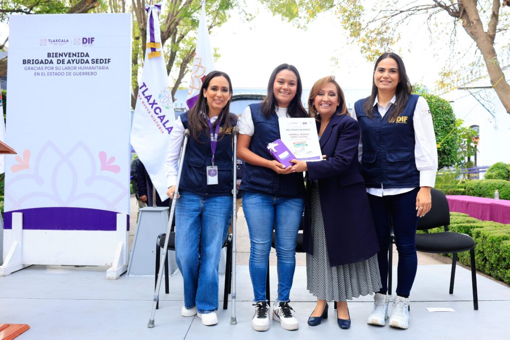 La gobernadora Lorena Cuéllar Cisneros y la presidenta honorífica del Sistema Estatal para el Desarrollo Integral de la Familia (Sedif), Mariana Espinosa de los Monteros Cuéllar, entregaron reconocimientos a los brigadistas que acudieron en apoyo a los damnificados por el huracán “Otis” en Acapulco, Guerrero.