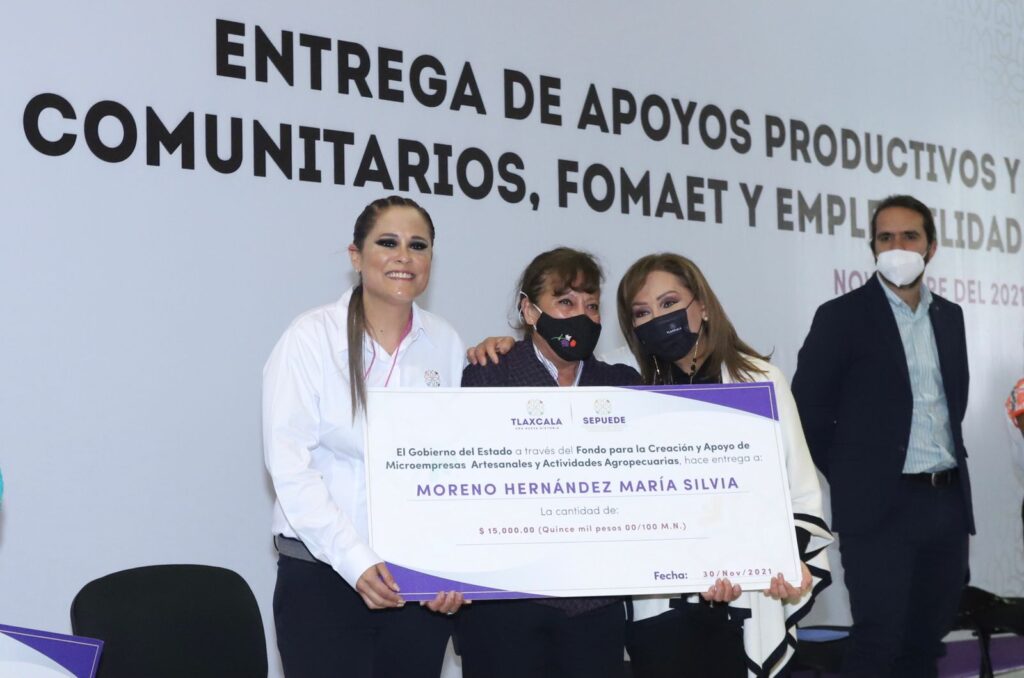 La gobernadora Lorena Cuéllar Cisneros realizó la entrega de apoyos productivos y comunitarios, así como del Fondo para la Creación y Apoyo de Microempresas Artesanales y Actividades Agropecuarias del Estado de Tlaxcala (Fomaet) y Empleabilidad, a través del Servicio Nacional de Empleo (SNE) y el Sistema Estatal de Promoción del Empleo y Desarrollo Comunitario (Sepuede), con el objetivo de beneficiar a pobladores de los sectores más vulnerables.
