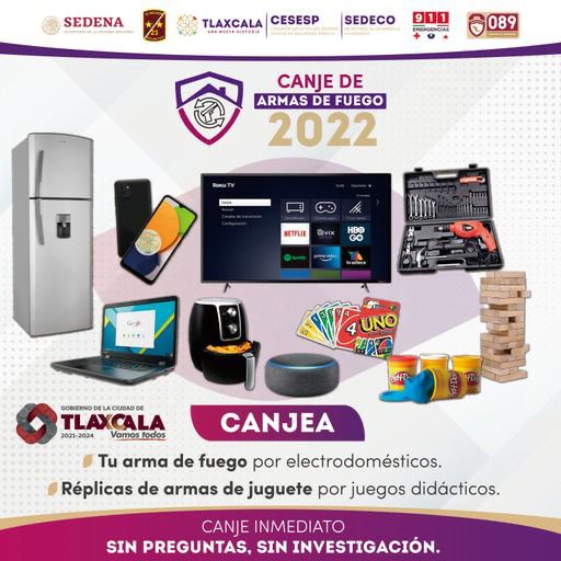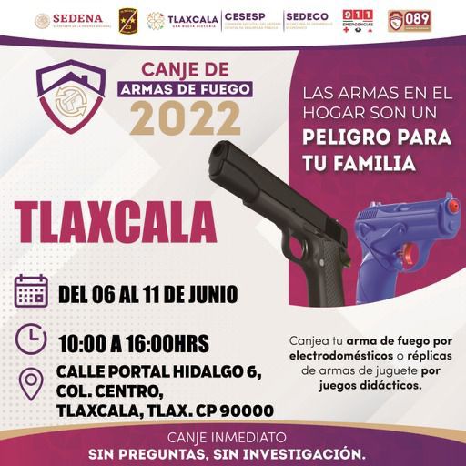 Tlaxcala Capital iniciará este lunes, en coordinación con la Secretaría de Seguridad Ciudadana (SSC) y la Secretaría de la Defensa Nacional (SEDENA), con el Programa de Canje de Armas de Fuego 2022, con el propósito de evitar accidentes en casa, disminuir la portación ilegal de armas de fuego, concientizar sobre los riesgos de tener un arma en casa e inhibir los índices delictivos por portación de arma de fuego.