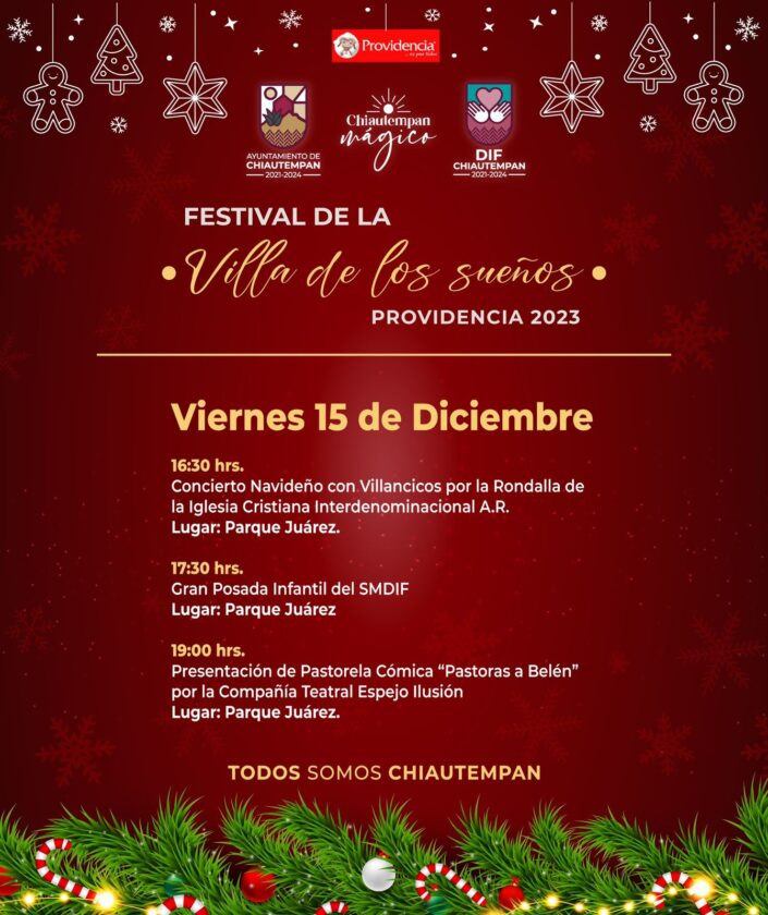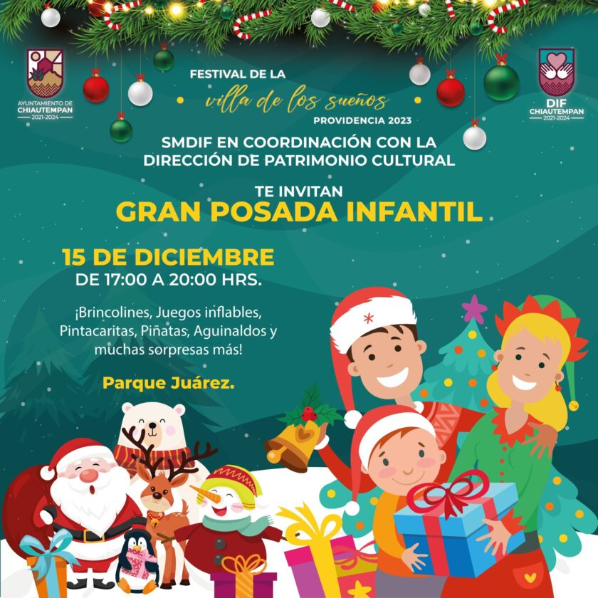 El Ayuntamiento de Chiautempan y el Sistema Municipal para el Desarrollo Integral de la Familia (SMDIF) en coordinación con la Dirección de Patrimonio Cultural invitan a la Gran Posada Infantil y eventos navideños.
