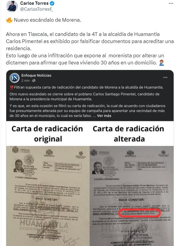 Y es que, de acuerdo con diversas denuncias, Carlos Pimentel habría alterado su carta de radicación, el cual es un documento que pide el Instituto Tlaxcalteca de Elección (ITE) para cumplimentar el registro como candidato a presidente municipal.