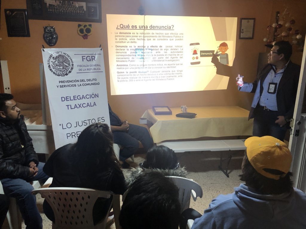 Personal del área de Prevención del Delito y Servicios a la Comunidad de la Fiscalía General de la Republica (FGR) en Tlaxcala, en coordinación con el Grupo Prevención del delito, de la Dirección de Seguridad Pública Municipal de Chiautempan, impartieron pláticas de seguridad a un grupo de vecinos de esta localidad.